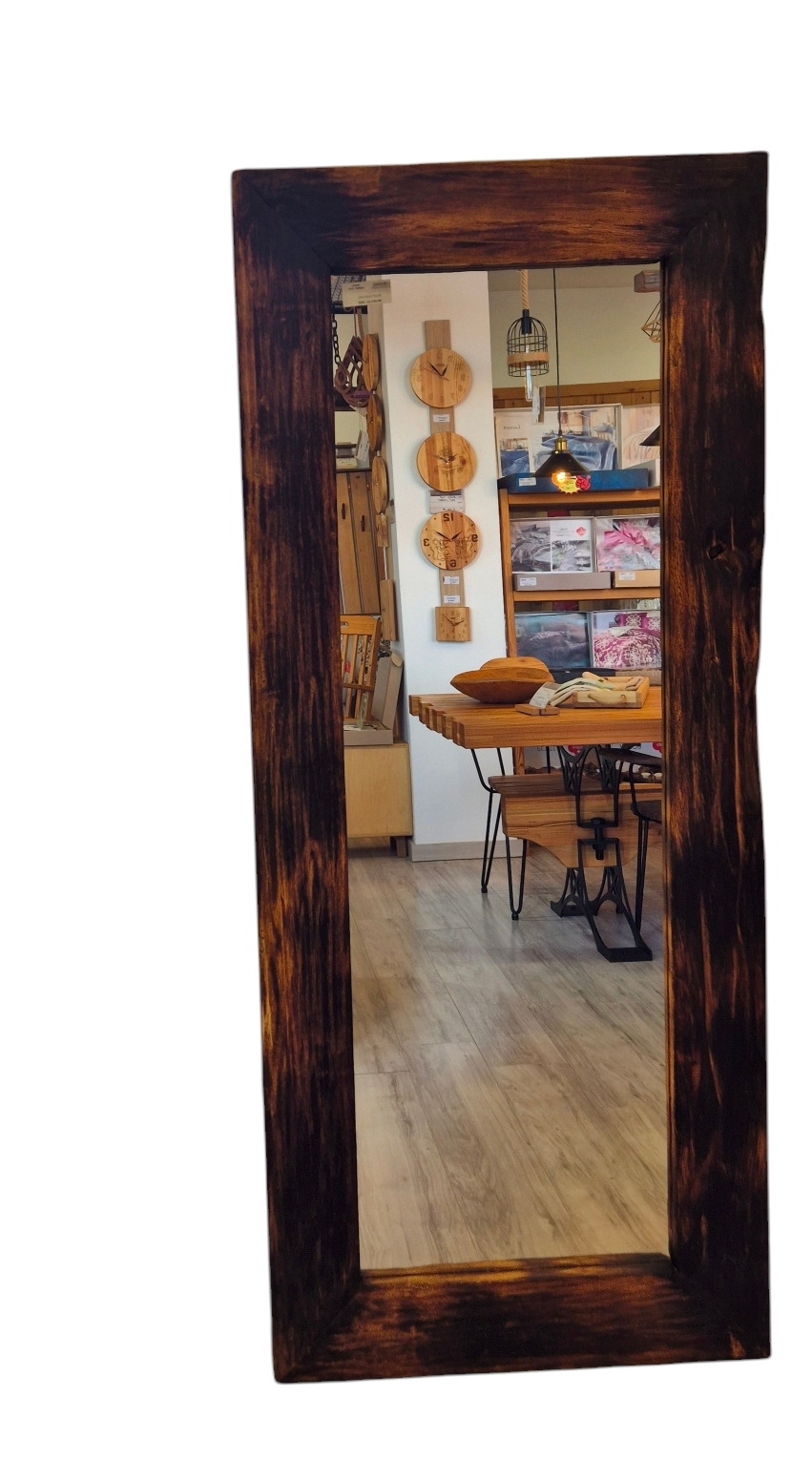 Ogledalo rusticnog izgleda, napravljen od drveta Egzota ili Topole . Ram koji odiše toplinom i autentičnošću. Njegova tekstura je gruba i neujednačena, često sa vidljivim tragovima drvenih vlakana, što dodaje rustičan šarm ogledalu.