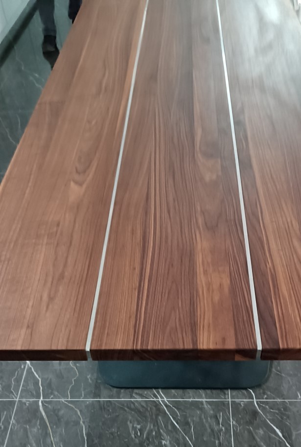 Trpezarijski sto je izrađen od američkog parenog oraha, što mu daje bogat i elegantan izgled. Njegova ploča, dimenzija 100×260 cm, ima luksuznu završnu obradu s dvije ugrađene inox (nehrđajući čelik) trake, dodajući dašak moderne sofisticiranosti. Kontrastni metalni sjaj inox traka lijepo nadopunjuje tople tonove američkog oraha. Baza stola ima čvrstu metalnu konstrukciju, pedantno premazanu mat crnom završnom obradom kroz proces plastifikacije. Ovo ne samo da povećava njegovu izdržljivost, već i daje savremenu i elegantnu estetiku cjelokupnom dizajnu. Sa svojim ekspanzivnim dimenzijama i elegantnim elementima, ovaj trpezarijski sto je središnji deo koji neprimetno kombinuje funkcionalnost sa estetskom privlačnošću u svakom trpezarijskom prostoru.