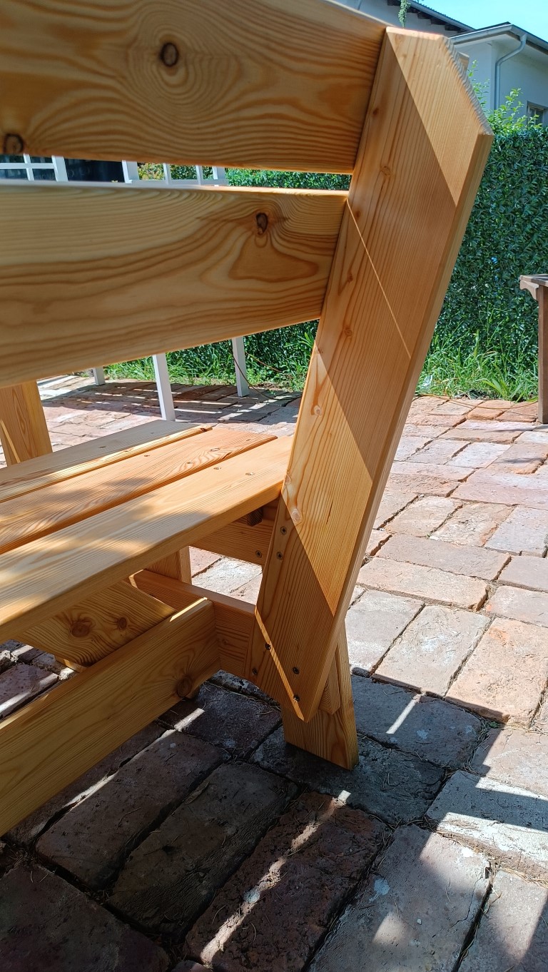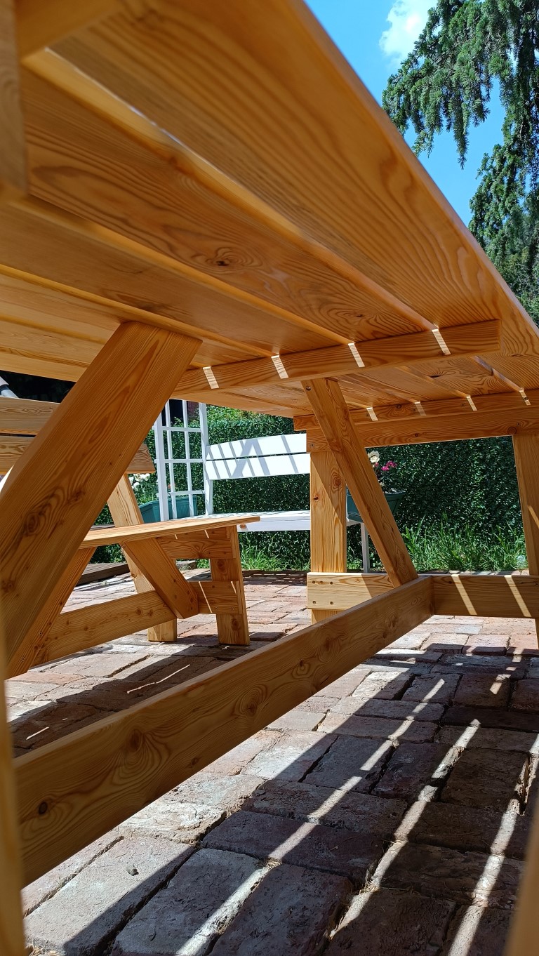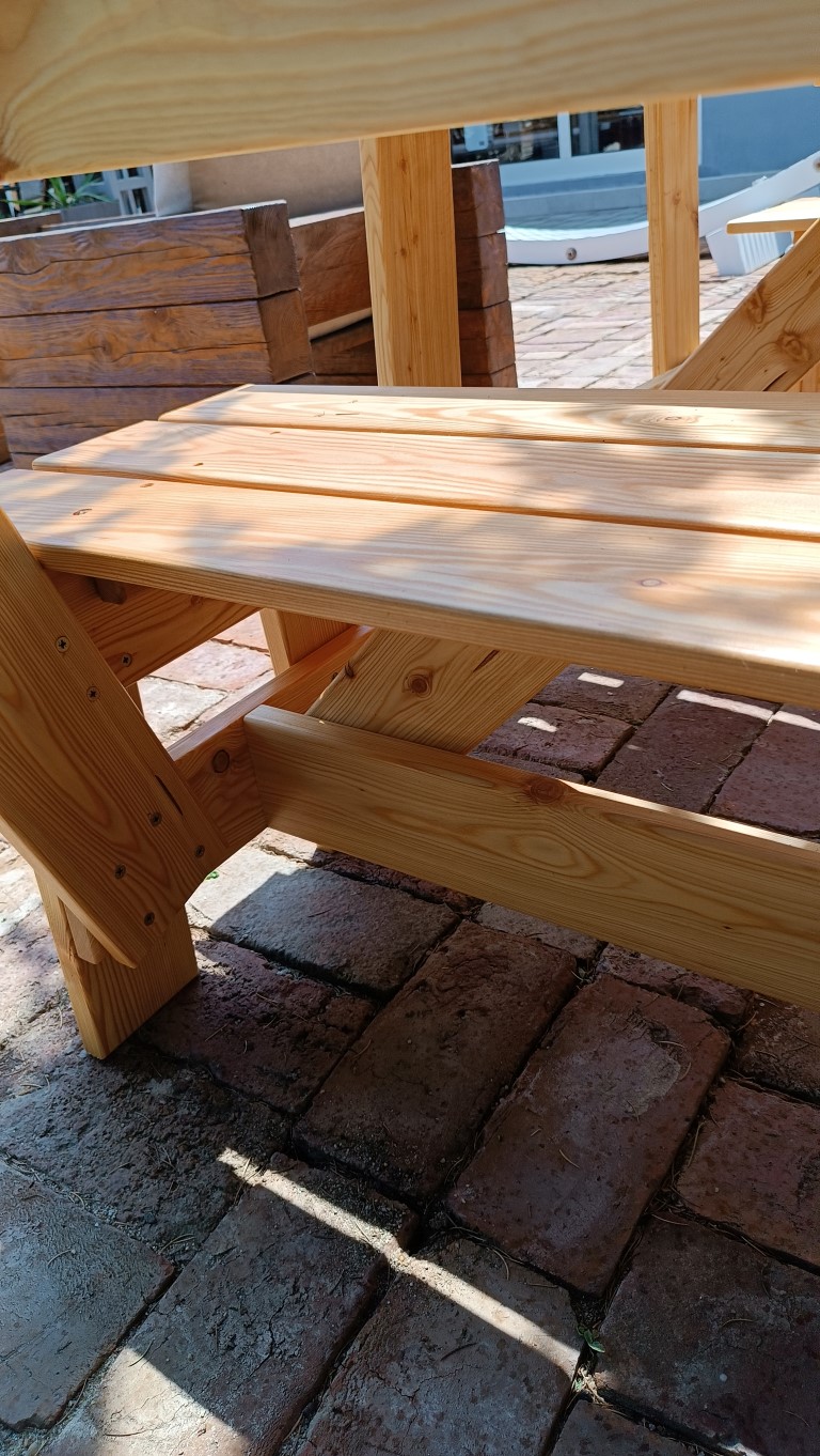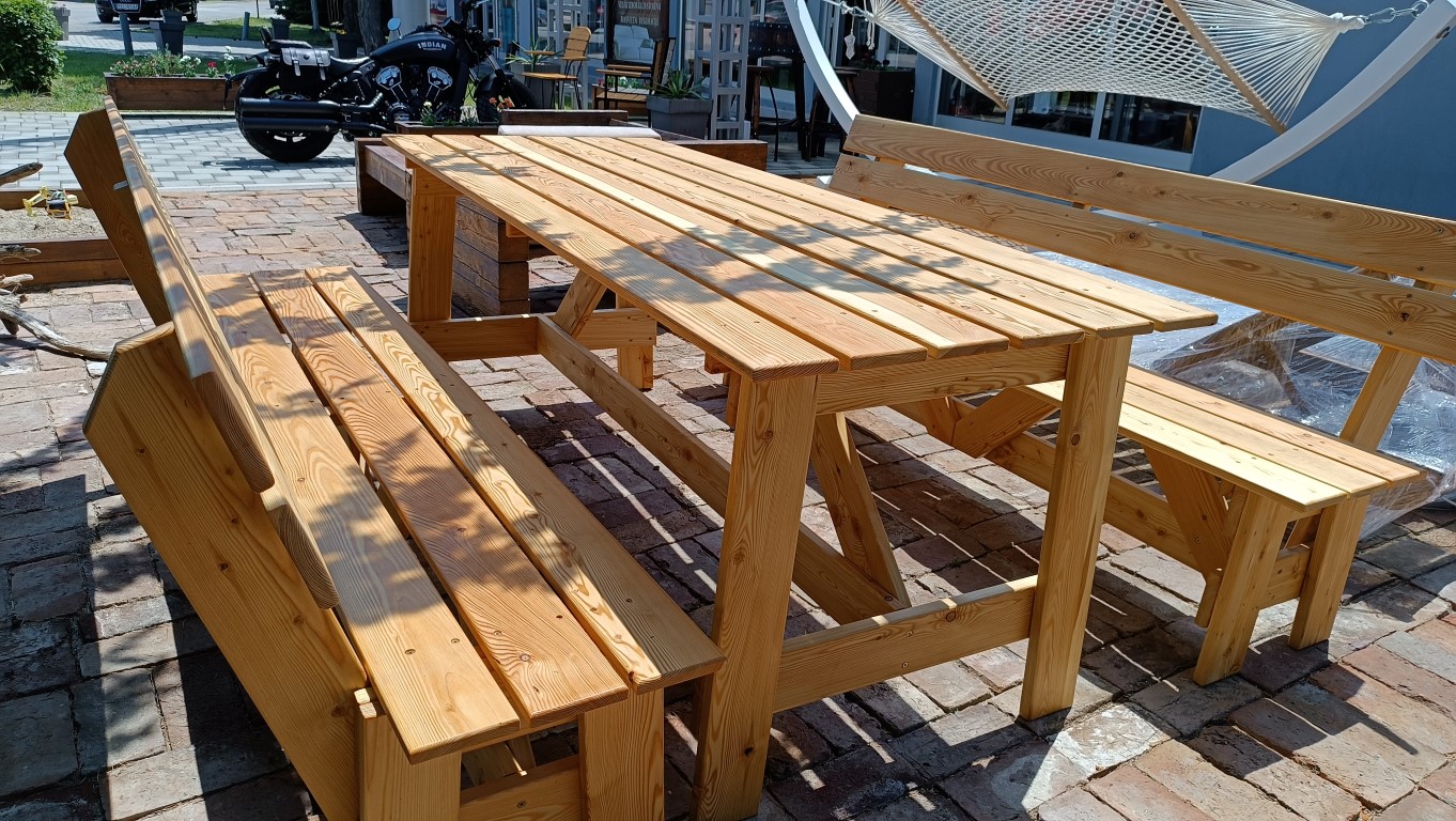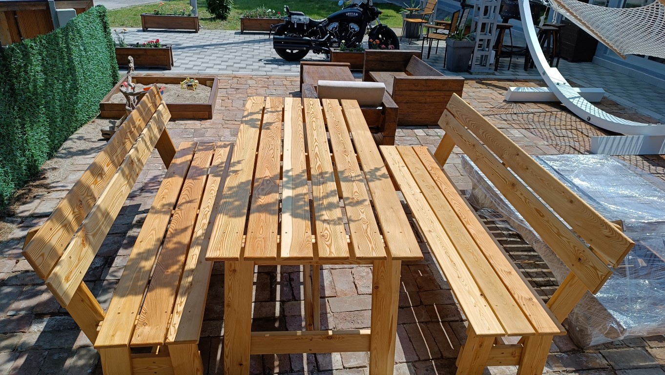 Atraktivni baštenski sto sa dve klupe kompletno izrađen od Sibirskog ariša, drveta visoke čvrstoće i pouzdanosti.