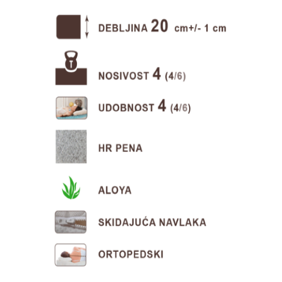 Centralni sloj dušeka čini 12 cm sunđera gustine 32 kg/m3 pojačanog elasticiteta, sa obe strane centralnog sloja nalazi se po 3 cm HR pene gustine 30 kg/m3.