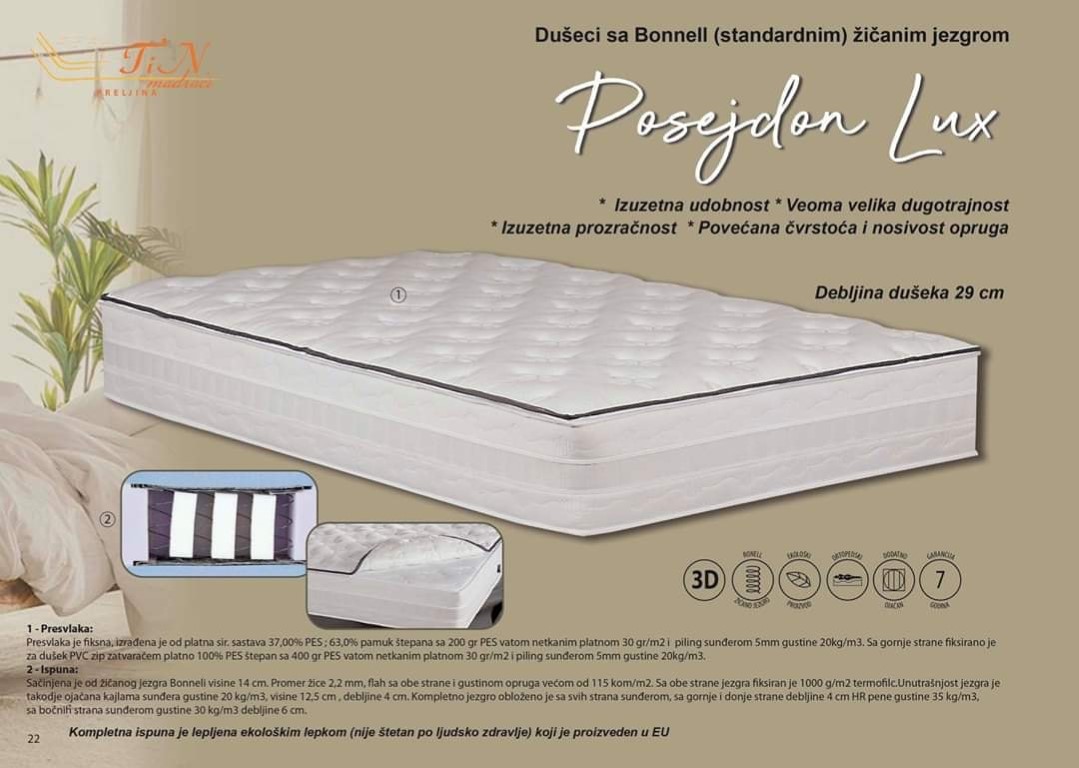 Sačinjena je od žičanog jezgra Bonneli visine 14 cm.Promer žice 2,2 mm, flah sa obe strane i gustinom opruga većom od 115 kom/m2. Sa obe strane jezgra fiksiran je 1000 g/m2 termofilc. Unutrašnjost jezgra je takodje ojačana kajlama sunđera gustine 20 kg/m3, visine 12,5 cm , debljine 4cm. Kompletno jezgro obloženo je sa svih strana sunđerom, sa gornje i donje strane debljine 4 cm HR pene gustine 35 kg/m3, sa bočnih strana sunđerom gustine 30 kg/m3 debljine 6 cm. Kompletna ispuna je lepljena ekološkim lepkom (nije štetan po ljudsko zdravlje), koji je proizveden u EU.