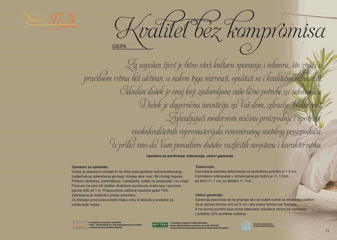 Garancija proizvoda se ne priznaje ako se dušek koristi na letvičastoj podlozi čiji je razmak letvica veći od 5 cm i ako svaka letvica nije fiksirana ili na ravnoj površini koja nema adekvatno izbušene otvore za ventilaciju (približno 20% površine dušeka).