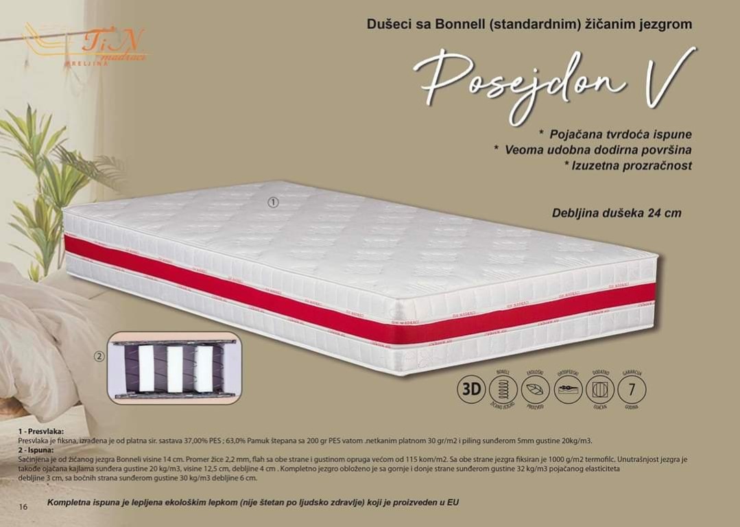 Izaberite dušek Posejdon V za luksuznu udobnost i podršku tokom spavanja. Ovo je dušek koji će transformisati vaše spavaća soba u oazu opuštanja i mira. Uživajte u vrhunskom kvalitetu sna i probudite se svakog jutra osveženi i puni energije.
