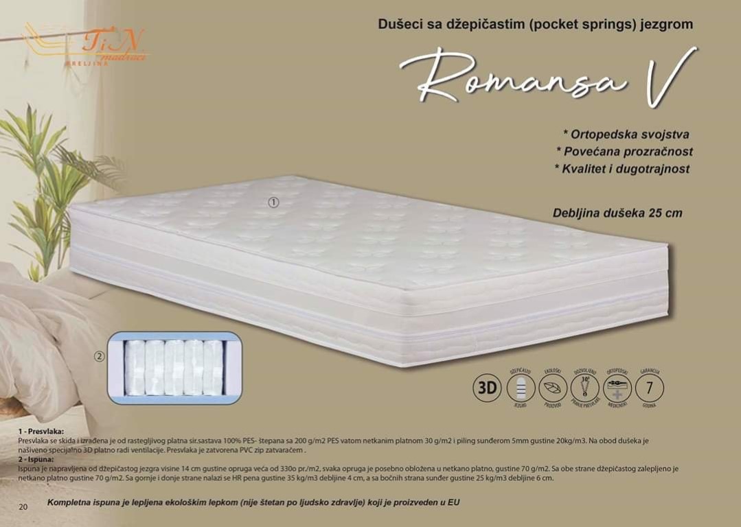 Ispuna je napravljena od džepičastog jezgra visine 14 cm gustine opruga veća od 330 opr./m2, svaka opruga je posebno obložena u netkano platno, gustine 70 g/m2. Sa obe strane džepičastog jezgra zalepljeno je netkano platno gustine 70 g/m2. Sa gornje i donje strane nalazi se HR pena gustine 35 kg/m3 debljine 4 cm, a sa bočnih strana sunđer gustine 25 kg/m3 debljine 6 cm. Kompletna ispuna je lepljena ekološkim lepkom (nije štetan po ljudsko zdravlje), koji je proizveden u EU.