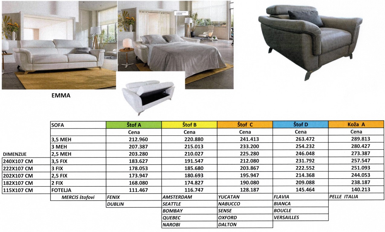 Materijali: veliki izbor visokovalitetne kože kao i mogućnost izbora u MERCIS štofu.