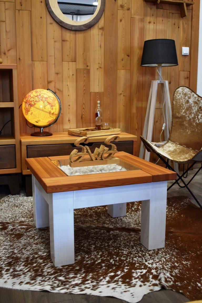 Klub sto 11 kamenčići, ručne izrade od punog drveta i stakla sa dekoracijom belih kamenčića.