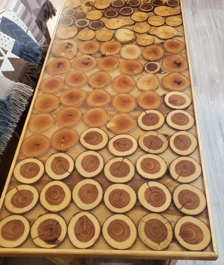 Ovaj sajt vam nudi klub sto napravljen od lamiliranog drveta Sibirskog Ariša, koji je poznat po svojoj izdržljivosti i lepoti. Gornja ploča stola ima čeone komade kruške, trešnje, bagrema i duge, što stolu daje prirodni i rustični izgled. Ovi komadi drveta su zaliveni epoxy smolom MAT, koji im daje dodatnu zaštitu i čini ih dugotrajnijim.