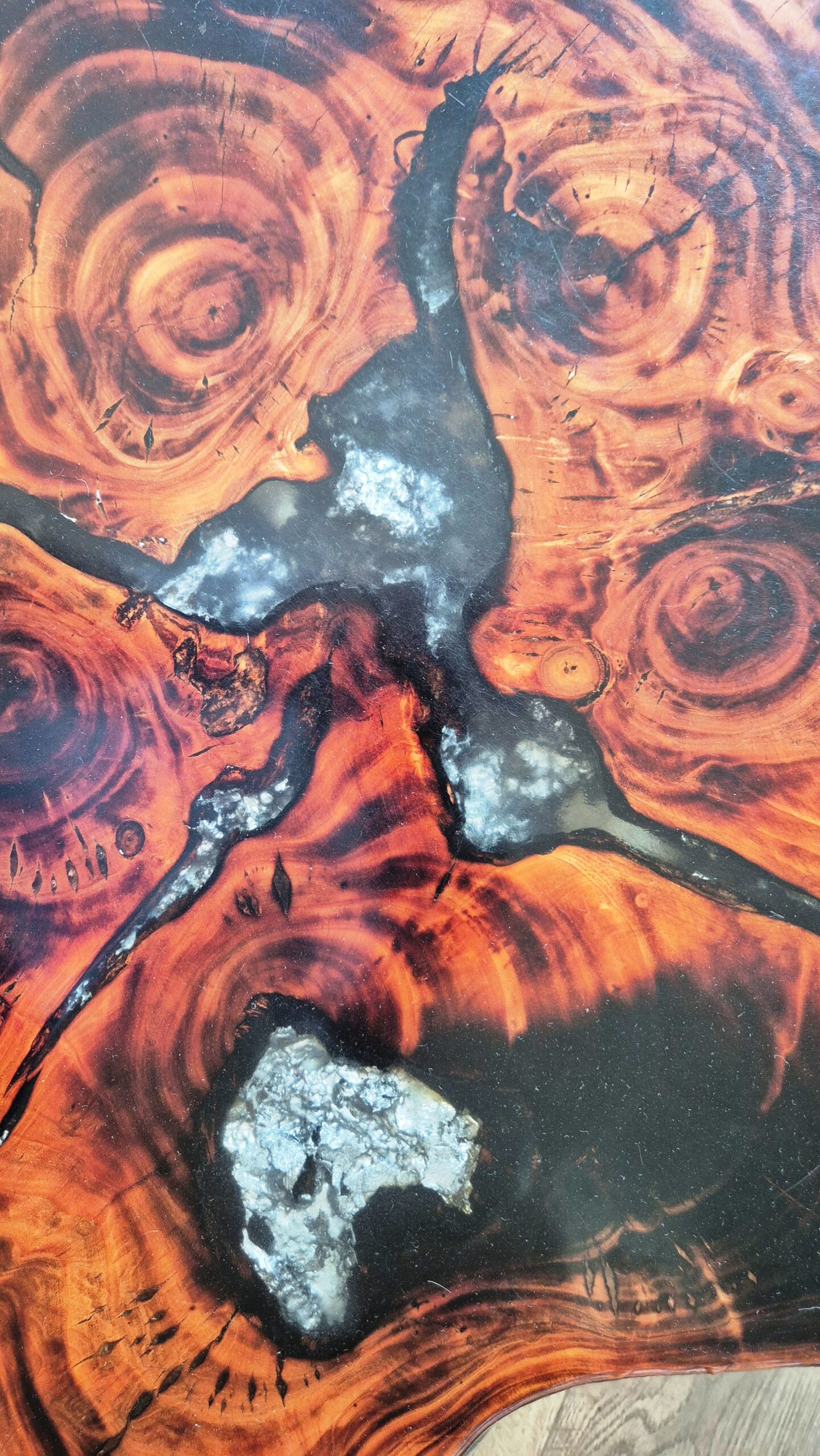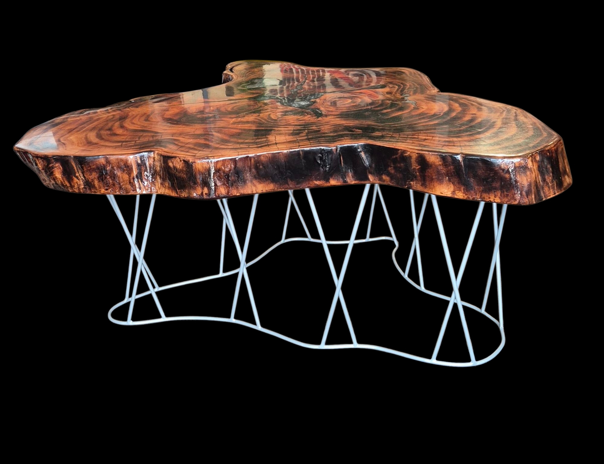 Klub sto napravljen od drveta Mazera sa epoxydnom smolom i metalnim nogama koje imaju stopice za štelovanje visine.
