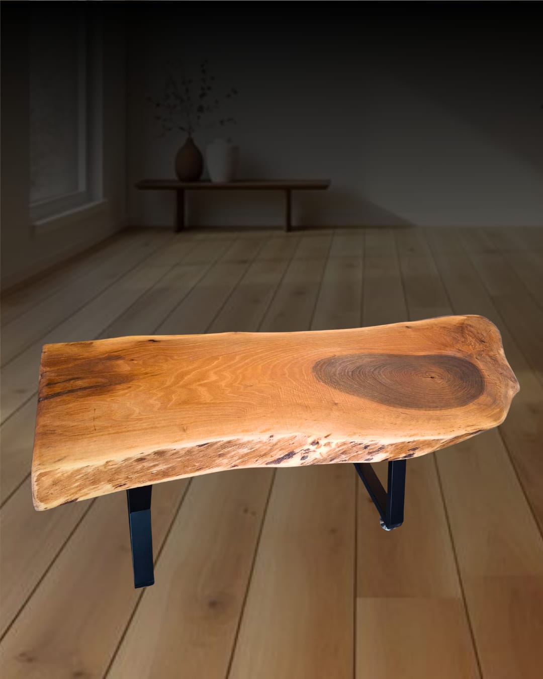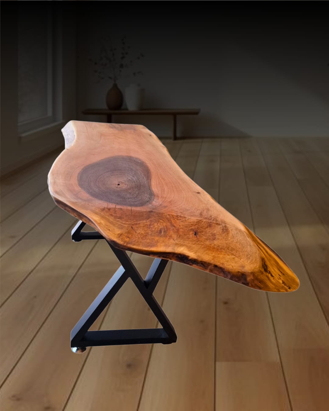 Ploča stola je napravljena od nepravilne daske oraha sa tri strane koje zadržavaju prirodne ivice, naglašavajući organsku lepotu drveta.