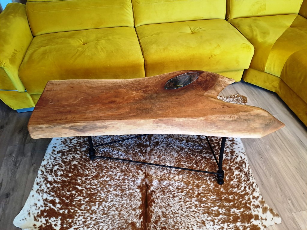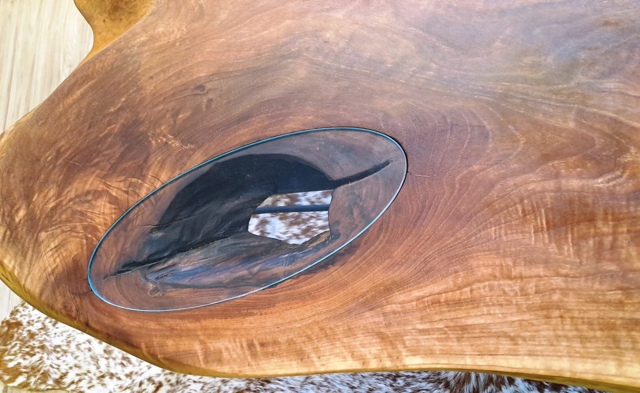 Karakteristična karakteristika ovog stola je rupa od grane, ispunjena precizno ugrađenim providnim staklom. Ovo dodaje intrigantnu fokusnu tačku, prikazujući prirodnu istoriju drveta.