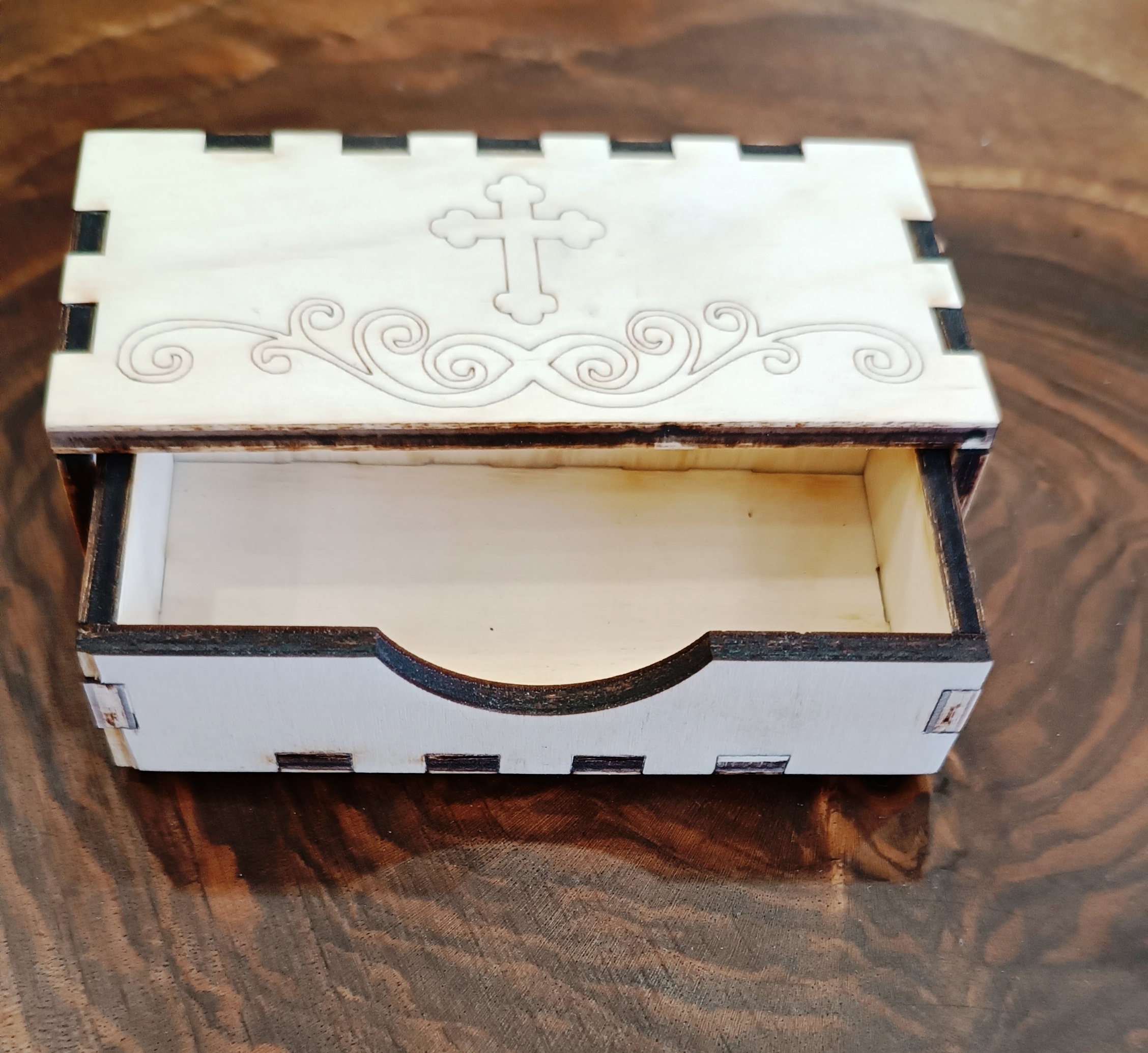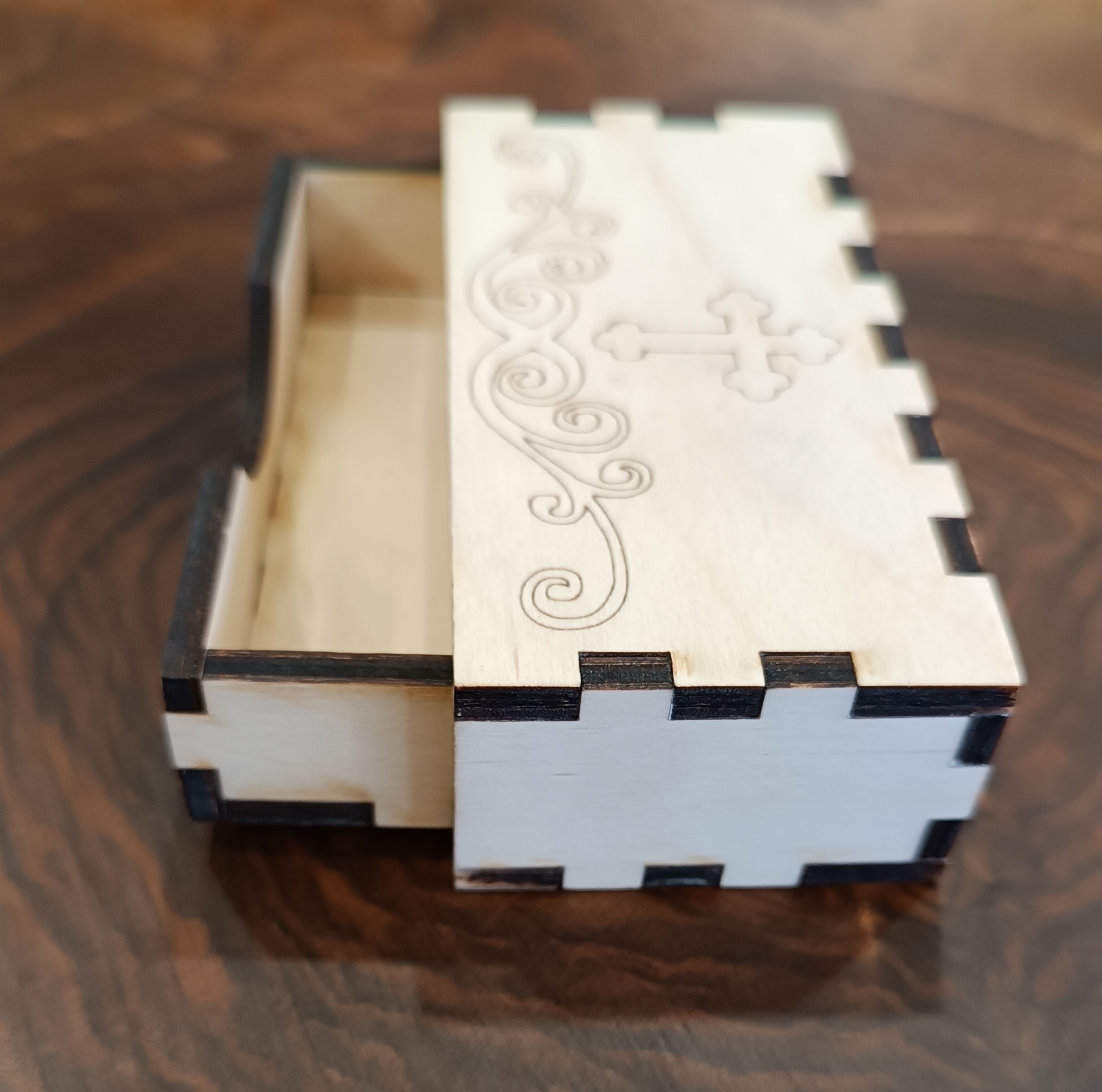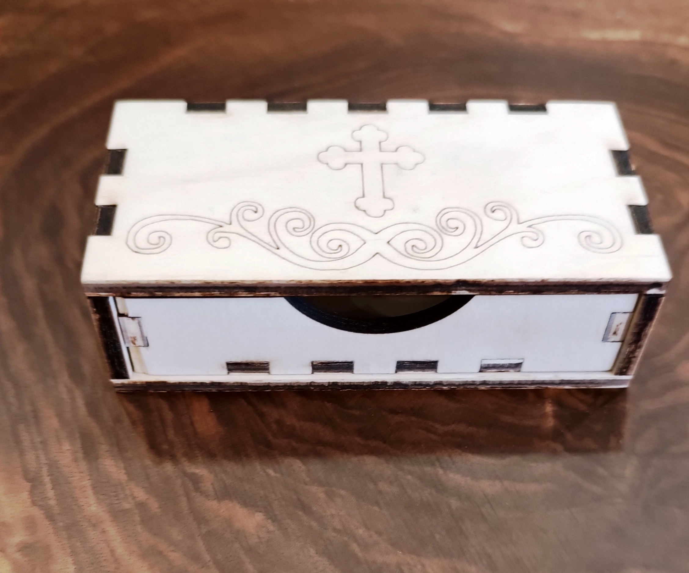 Ova prekrasna kutijica za tamjan je izrađena od šperploče, pružajući joj izdržljivost i čvrstinu. Dimenzije kutijice su kompaktne, savršene za odlaganje tamjana ili drugih mirisnih materijala.