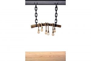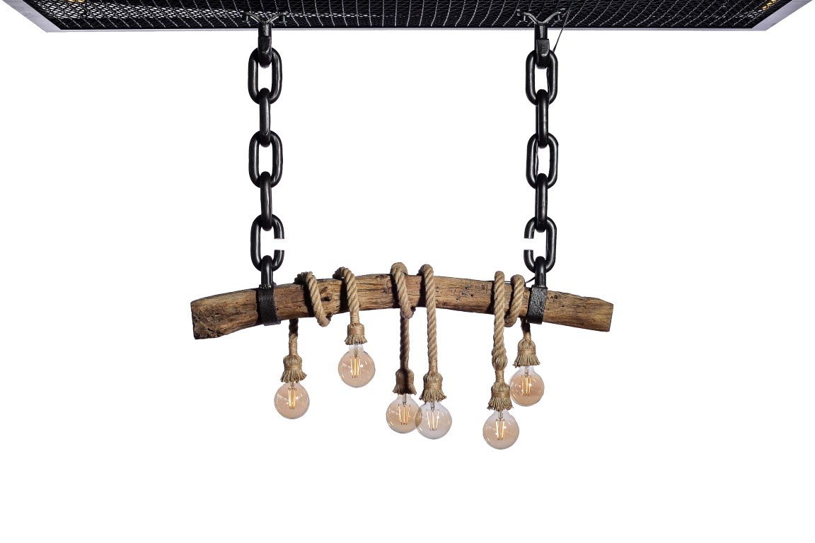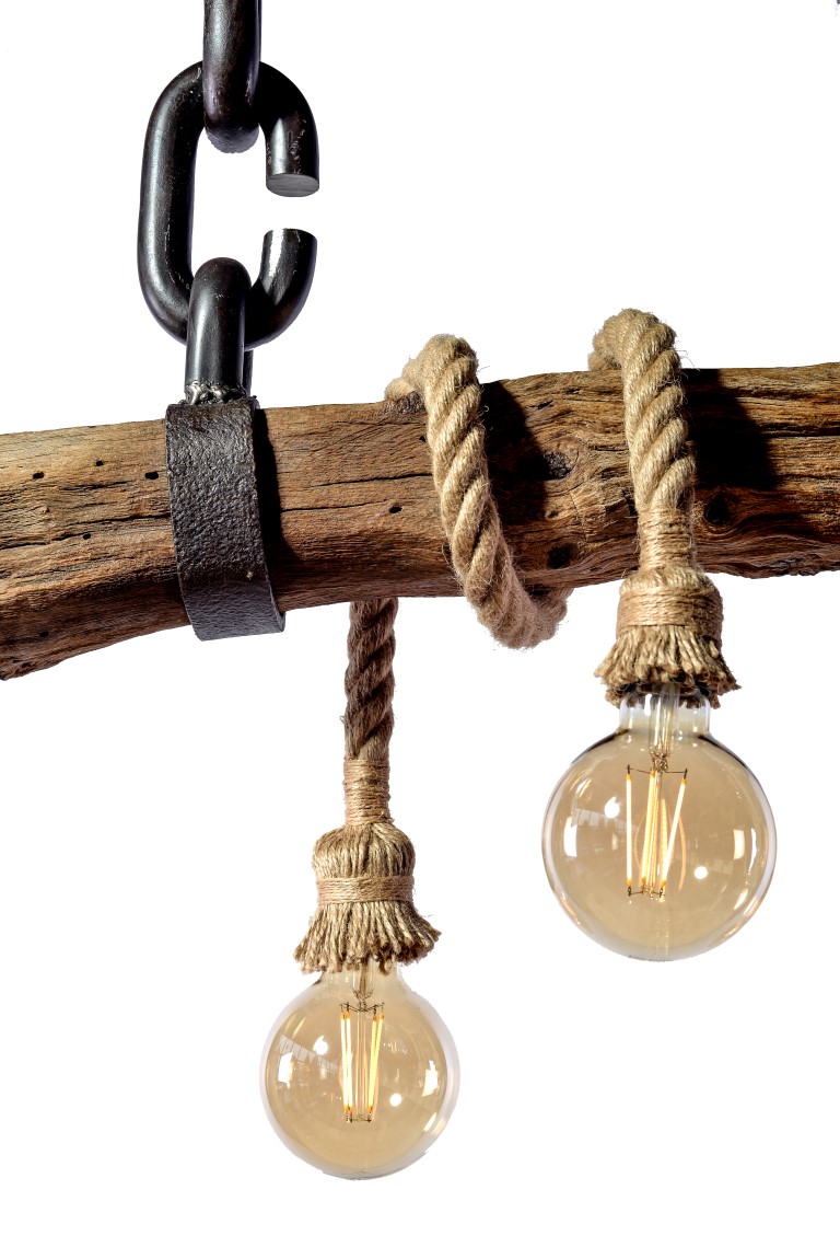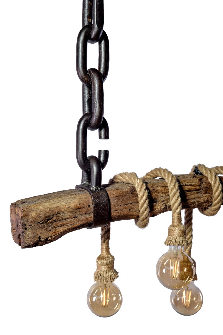 Luster Rustik modernog a opet retro dizajna sa modernim sijalica i uz korišćenje dimera za smanjivanje jačine osvetljenja lepo doprinosi ugađaju u bilo kojoj atmosferi.Prirodno staro drvo,greda, tretirano najboljim prirodnim uljima iz uvoza u kombinaciji sa metalnim lancima i kanapom čini ovaj luster zanimljivim i ujednako skoro jedinstvenim.