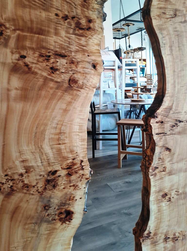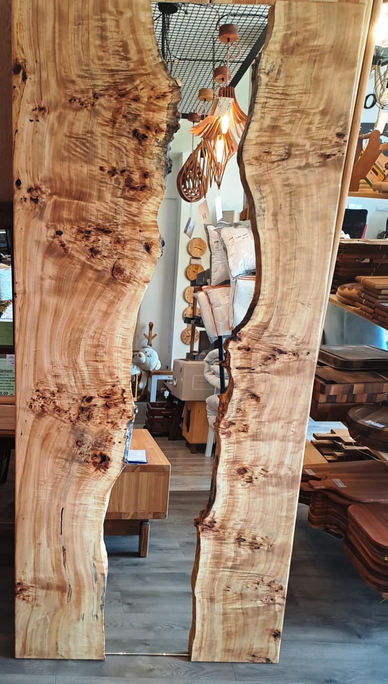 Ovo jedinstveno ogledalo napravljeno je od dve prelepe daske, sa prirodnim ivicama okrenutim prema unutra prema ogledalu. Dimenzije ogledala su 90×200 cm, što ga čini upečatljivim komadom za svaki prostor. Drvo je zaštićeno prirodnim uljem i poboljšano voskom za lepu i izdržljivu završnu obradu.
