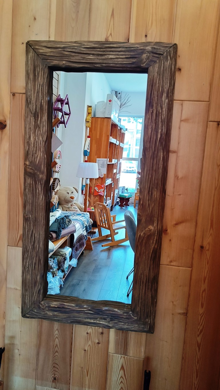 Ogledalo rusticnog izgleda, napravljen od drveta Jele . Ram koji odiše toplinom i autentičnošću. Njegova tekstura je gruba i neujednačena, često sa vidljivim tragovima drvenih vlakana, što dodaje rustičan šarm ogledalu.