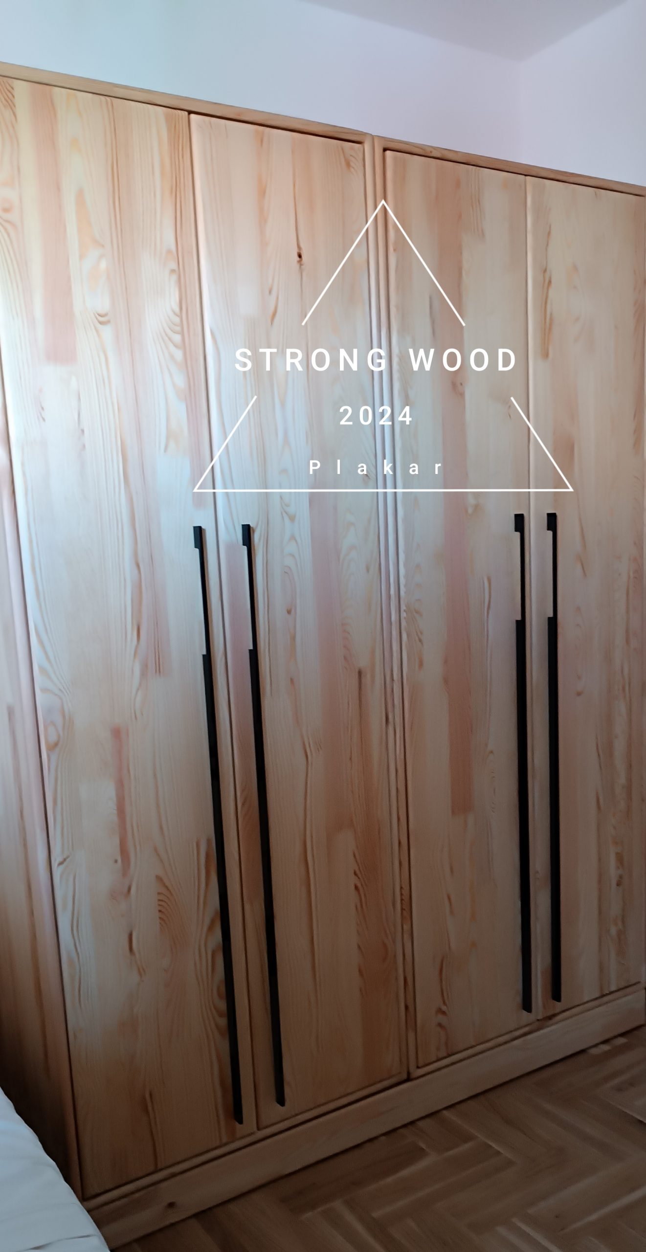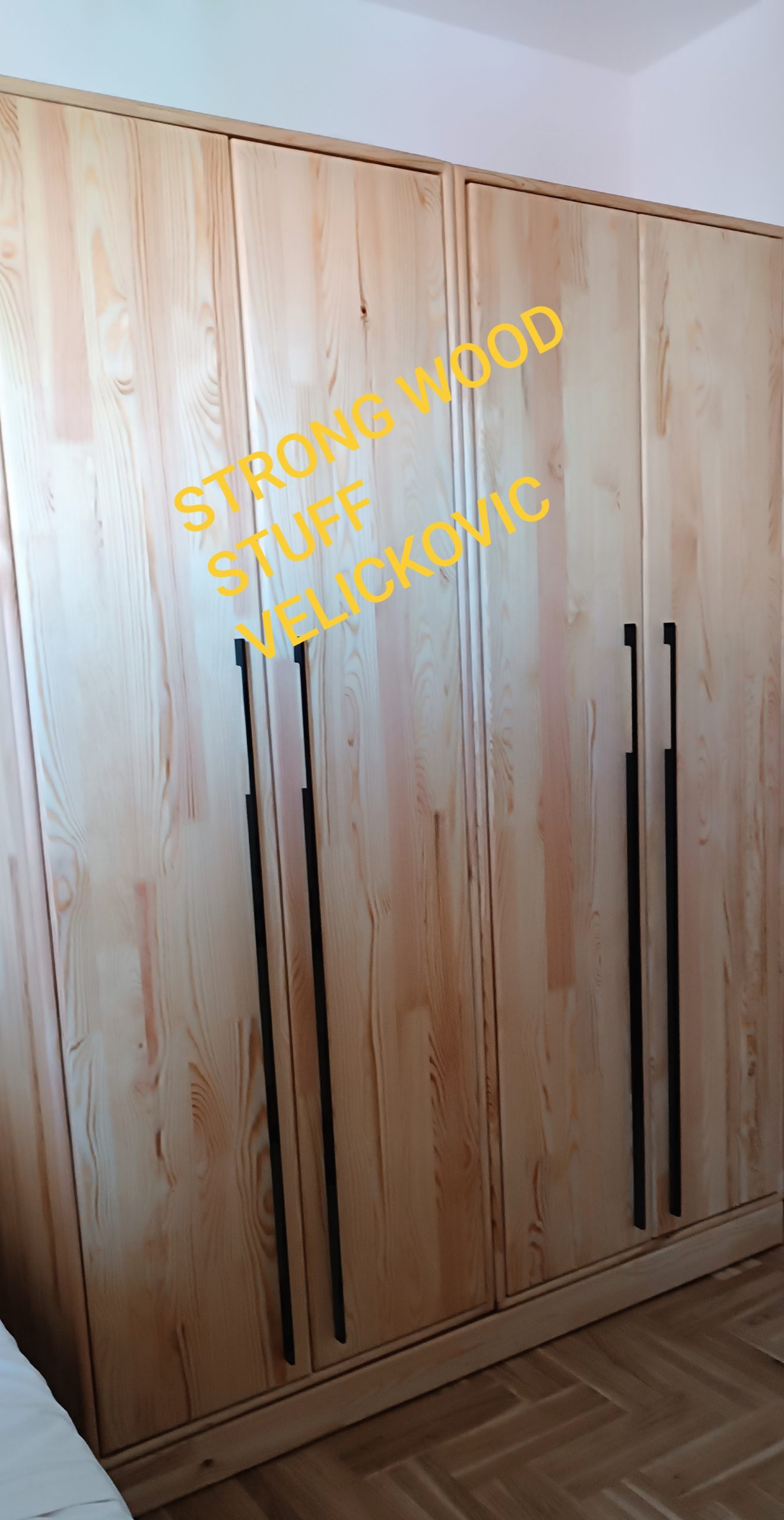 Naši ormari su prava remek-dela od punog drveta, izrađeni od lamiliranog sibirskog bora. Korpusi ormara su napravljeni od drveta debljine 22 mm, dok su krila vrata debljine 32 mm, pružajući izuzetnu stabilnost i čvrstoću. Svaki ormar je opremljen sa Blum šarkama poslednje generacije sa usporivačima ( pet šarki po krilu), omogućavajući glatko i tiho zatvaranje vrata.