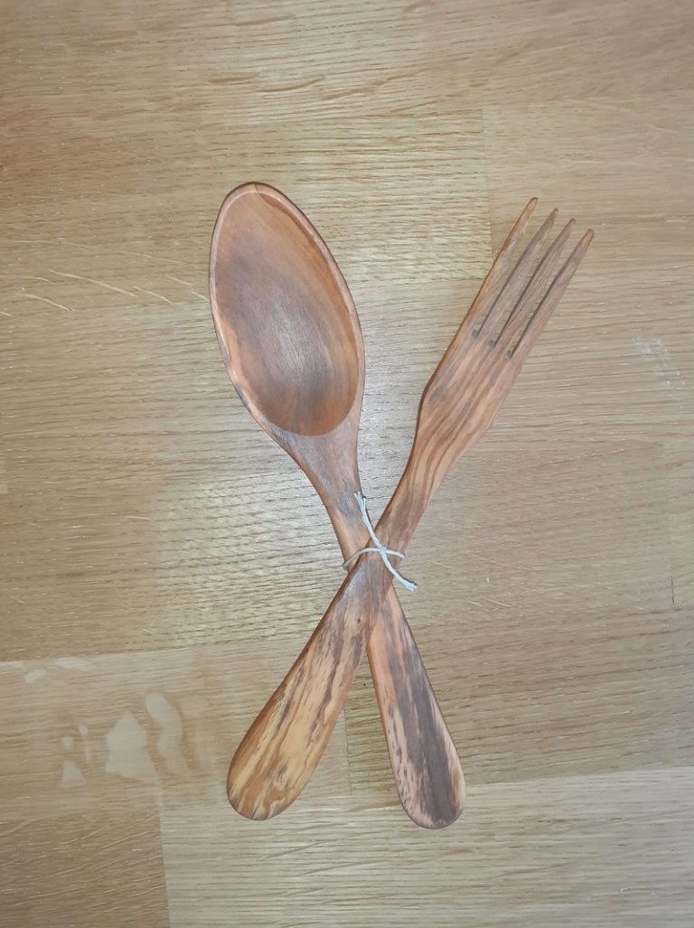 Set za salatu, ili jednostavnije, viljuška i kašika klasičnog oblika od maslinovine. Može da se koristi kao set, za serviranje, kod kuvanja, prženja, pečenja, sve zavisi od potreba ukućana. Ono šta je zadano je lepota drveta, velika praktičnost, fini osećaj u ruci. Nije bez razloga maslina veoma cenjeno drvo.