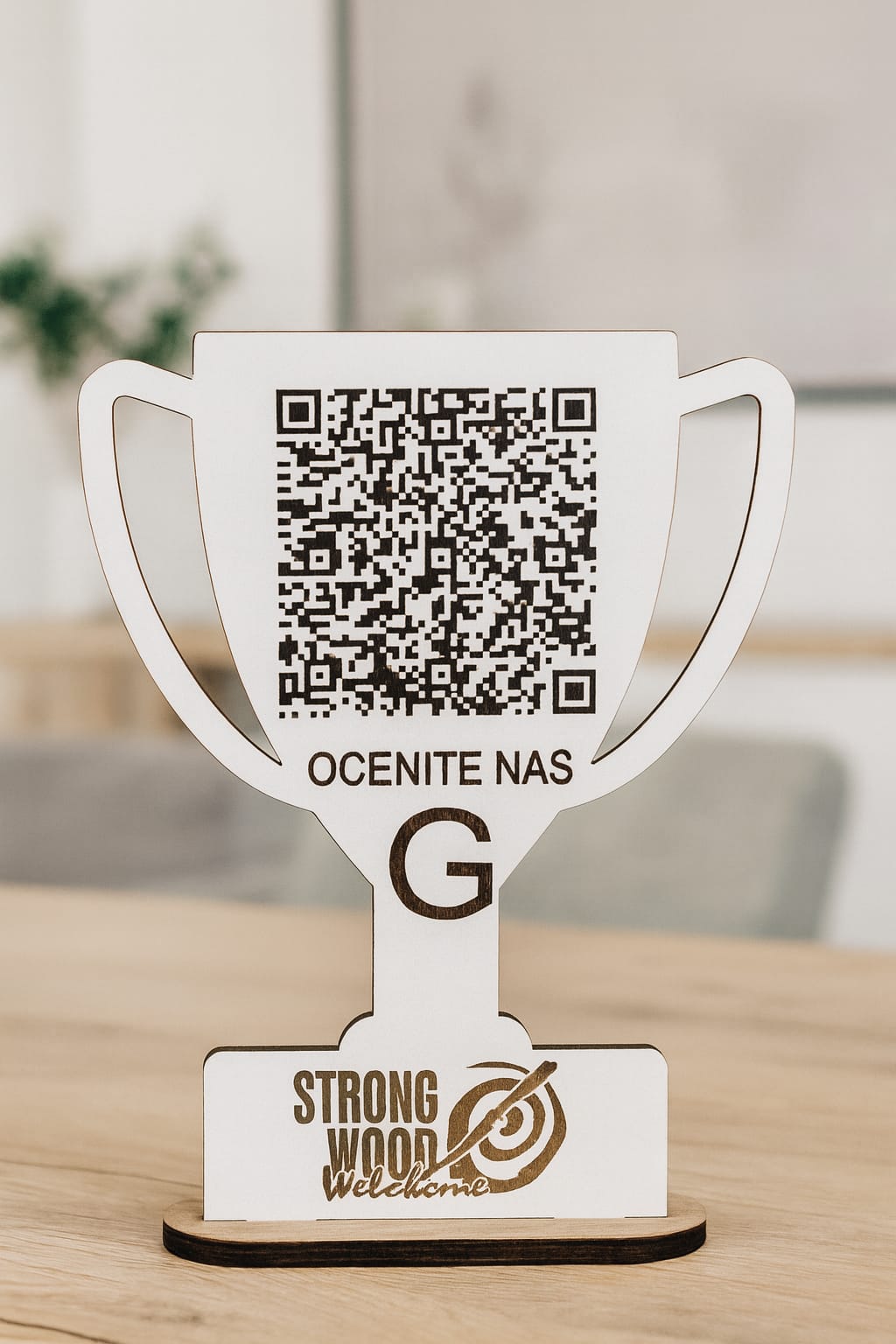 Ovaj elegantni stalak u obliku trofeja izrađen je od izdržljivog tvrdog HDF-a i dizajniran je da unese eleganciju i funkcionalnost u vaš poslovni prostor. Površina je ugravirana nazivom ili logotipom vaše kompanije, zajedno s jedinstvenim QR kodom koji jednostavnim skeniranjem odmah usmjerava kupce na vašu web stranicu ili stranicu za recenzije.