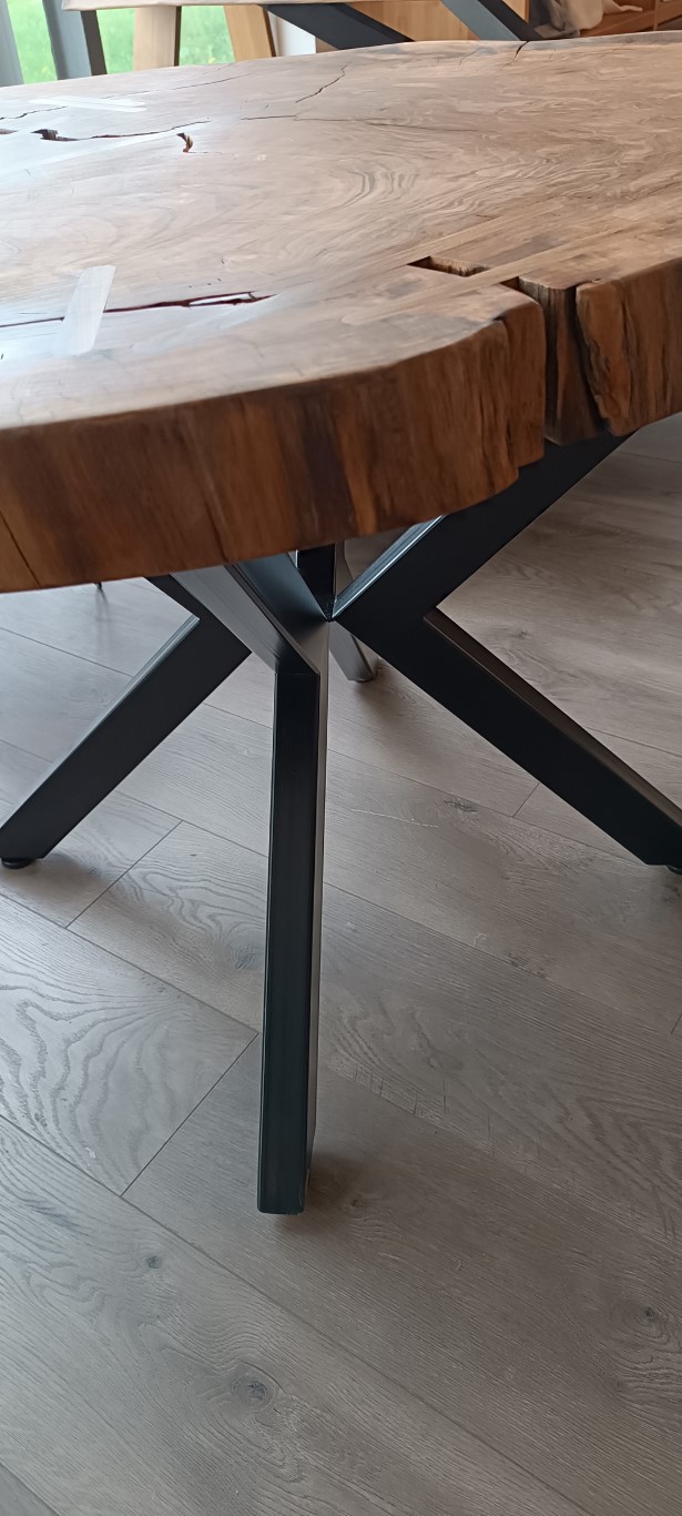 Noge stola izrađene su od metala i plastificirane u elegantnu crnu boju, pružajući stabilnost i savremen izgled. Dimenzije stola su oko 120 cm dužine i 72 cm visine, što ga čini pogodnim za trpezarije različitih veličina. Ovaj sto kombinuje prirodne elemente drveta sa industrijskim dizajnom nogu, stvarajući jedinstven komad nameštaja koji će privući pažnju i doprineti toplini prostora za obroke.