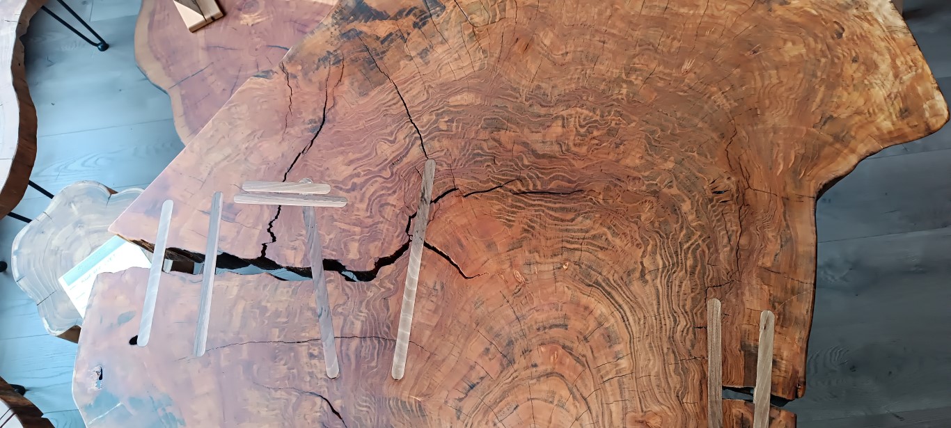Trpezarijski sto izrađen je od nepravilnog panja drveta mazera sa prirodnim ivicama koje mu daju autentičan izgled. Karakterišu ga otvorene pukotine koje doprinose rustičnom šarmu i dodaju poseban karakter komadu nameštaja. Da bi se istakla lepota drveta i obezbedila trajnost, sto je zaštićen slojem ulja sa dodatkom voska.