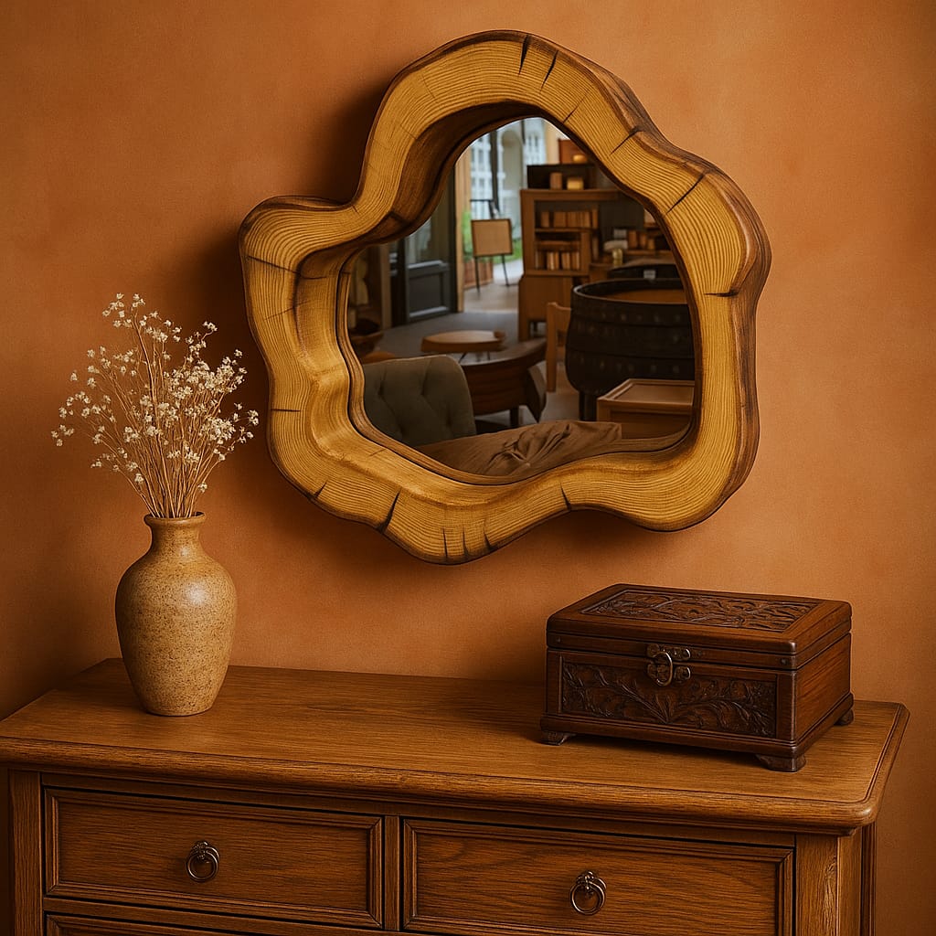 Ogledalo ima prirodan i jedinstven izgled, što ga čini idealnim za različite stilove enterijera. Bilo da je postavljeno u dnevnom boravku, hodniku ili spavaćoj sobi, ovaj komad bi mogao biti odličan dodatak enterijeru, dajući mu prirodan i autentičan izgled. Ovo ogledalo bi moglo biti savršen izbor za one koji traže funkcionalni komad nameštaja koji će se istovremeno istaći u prostoru.