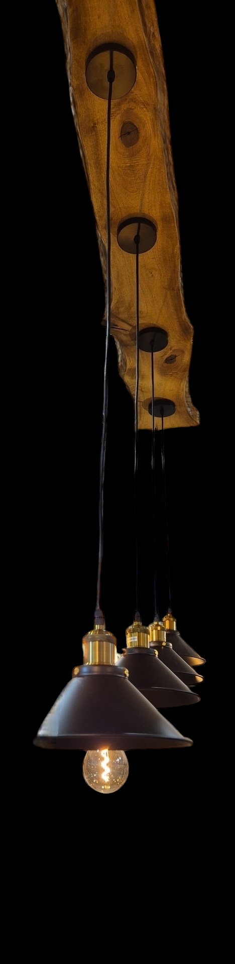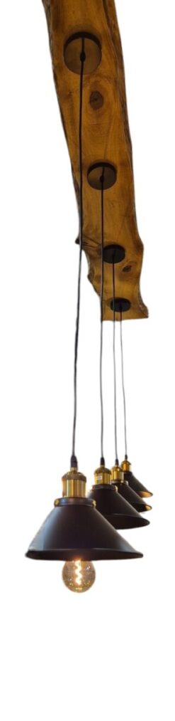 Na drvenoj podlozi instalirane su četiri visilice u vintage stilu, od kojih svaka ima mogućnost za podešavanje visine.